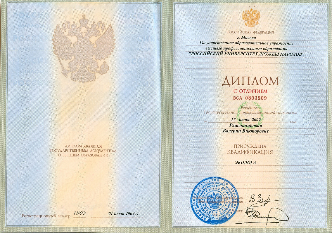 Российский Университет Дружбы Народов, экологический факультет, спецальность «экология». Диплом с отличием. В 2009 году присвоена квалификация «эколог».